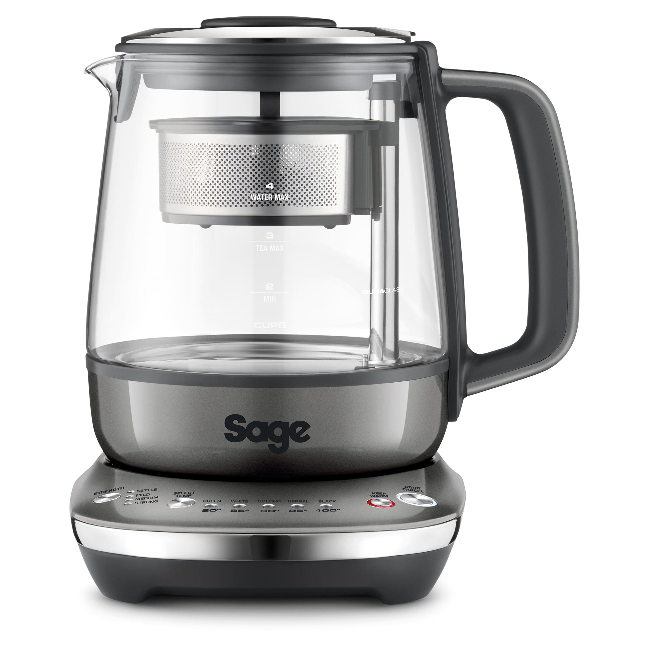 - Výber teploty podľa druhu čaju – Green (zelený), Black (čierny), White (biely), Herbal (bylinkový), alebo Oolong
